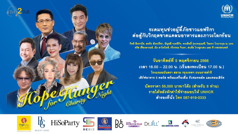 คุณสินีนารถ เองตระกูล ประธานกรรมการ บริษัท เทล ทู เทล จำกัด และสมาชิกกิตติมศักดิ์ กองทุนนักธุรกิจหญิงรุ่นใหม่เพื่อผู้ลี้ภัยของ UNHCR กล่าวว่า “บริษัท เทล ทู เทล จำกัด ของเราเป็นผู้ให้บริการด้าน Outsourced Contact Center มายาวนานกว่า 12 ปี โดยเราตั้งใจจัดทำโครงการเพื่อสังคมเป็นประจำทุกปีอยู่แล้วทั้งประเด็นที่เกิดขึ้นในประเทศไทยและทั่วโลก ซึ่งขณะนี้สภาวะโลกร้อนเป็นเรื่องใกล้ตัวเรามากขึ้น และส่งผลกระทบกับผู้คนหลายล้านคนจนต้องขาดแคลนอาหาร ซึ่งการจัดงานครั้งนี้ ต้องขอบคุณผู้สนับสนุนหลัก ได้แก่ บริษัท ทิพยประกันชีวิต จำกัด (มหาชน) ,Beauty Gems, SE Biz Group, KRS และผู้สนับสนุนร่วม ประกอบด้วย บริษัท ทิพยประกันภัย จำกัด(มหาชน), ผลิตภัณฑ์อาหารเสริม เด็กซ์ตร้า วีรุค พลัส ,DTGO ,HiSoParty ,Dr.Jill, Asia Industrial Estate, โรงแรม Casa Vimaya, Thai Pack, นมตรามะลิ และ ข่าว 3 มิติ ที่ทำให้งานการกุศลครั้งใหญ่ครั้งนี้เกิดขึ้น หวังเป็นอย่างยิ่งว่างานการกุศลในครั้งนี้จะสร้างงบประมาณเพื่อช่วยชีวิตเด็ก และครอบครัวผู้ลี้ภัยในทวีปแอฟริกาได้เพิ่มขึ้น ขอให้ทุกท่านมีความสุขและสนุกกับ “Hope for Hunger Charity Night: Talks and Concert” ค่ะ