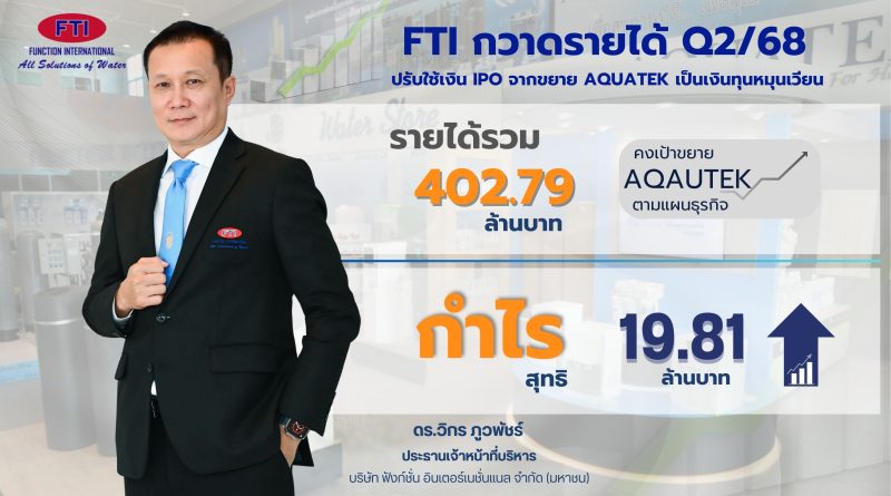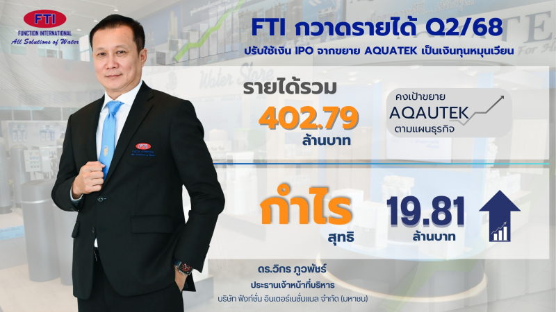 FTI กวาดรายได้ Q2/68 ที่ 402.79 ลบ. กำไร 19.81 ลบ. ปรับใช้เงิน IPO จากขยาย AQUATEK เป็นเงินทุนหมุนเวียน คงเป้าขยาย AQAUTEK ตามแผนธุรกิจ